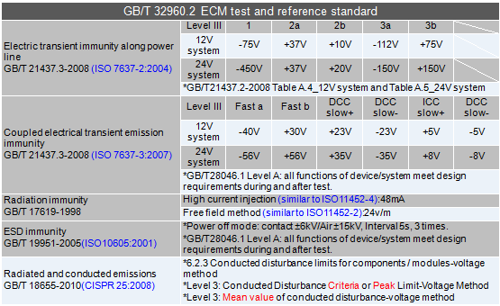 In order to ensure data accuracy integrity of on-board terminal product not to be interfered with other electronics or being damaged by abnormal energy coupling when collecting data, it is necessary to strictly test the electromagnetic compatibility test and adjust test level according to application environment except for meeting the basic electrical performance test. .The national recommended standard GB/T 32960.2 Technical specifications of remote service and management system for electric vehicles Part 2: On-board terminal states that test voltage levels of electromagnetic compatibility test items are usually defined by vehicle companies due to various degrees of test level. Figure 5 lists the reference test items that recommended by national standard.