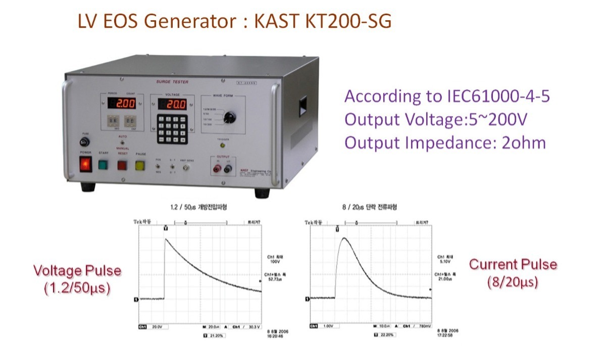 The rest of the inductors and the resistors will modify the output waveforms to meet the standards. Because the EOS output current will be produced in low EOS voltage, it will seriously damage the electronic equipment. There are several EOS testers used in the industry. Figure 5 shows Thermo KeyTek EMCPro Plus is high-voltage EOS test equipment, featuring the maximum voltage up to 6kV and generally applying for connecting to electronic equipment for the outdoor network, such as STB or router. In addition, KAST KT200-SG in Figure 6 is low-voltage EOS test equipment, featuring an output voltage of 200V and applying for indoor electronic products, such as smart phones, TV sets and display panels.
