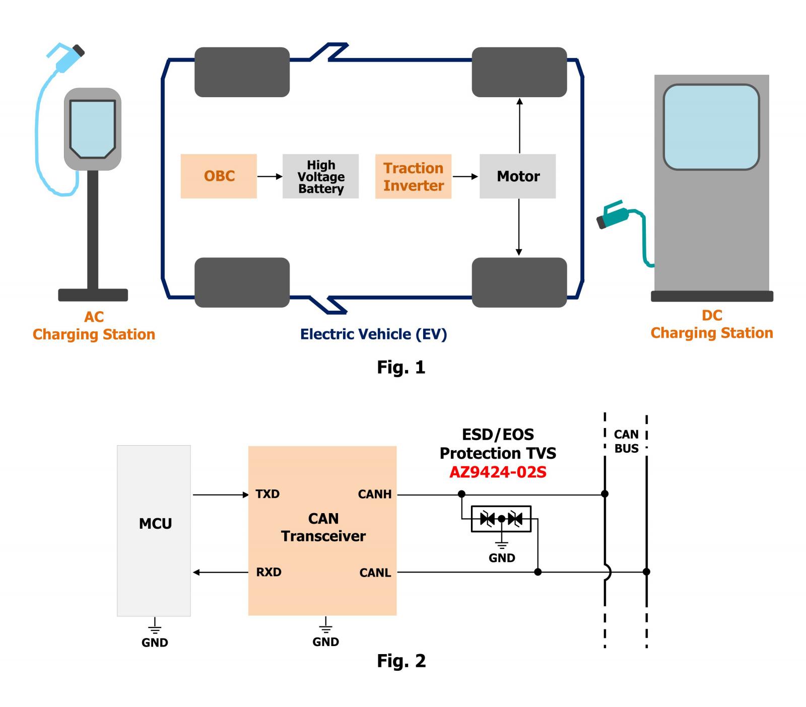 The function of the On-Board Charger is to provide AC to DC vehicle power supply equipment for charging electric vehicles. It usually needs to be collocated with an AC charging station as the output for charging. The TVS protection components of the On-Board Charger communication interface are as follows: