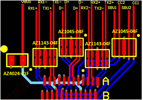 晶焱科技針對此應用推薦使用array方案AZ1143-04F於Tx.Rx訊號線,AZ1045-04F於CC、SBU、D+/D-上,AZ4024-01F於Vbus的全面性防護方案(如圖二),可有效防護Type-C接口免於靜電的威脅,提供VR應用更穩定的品質。